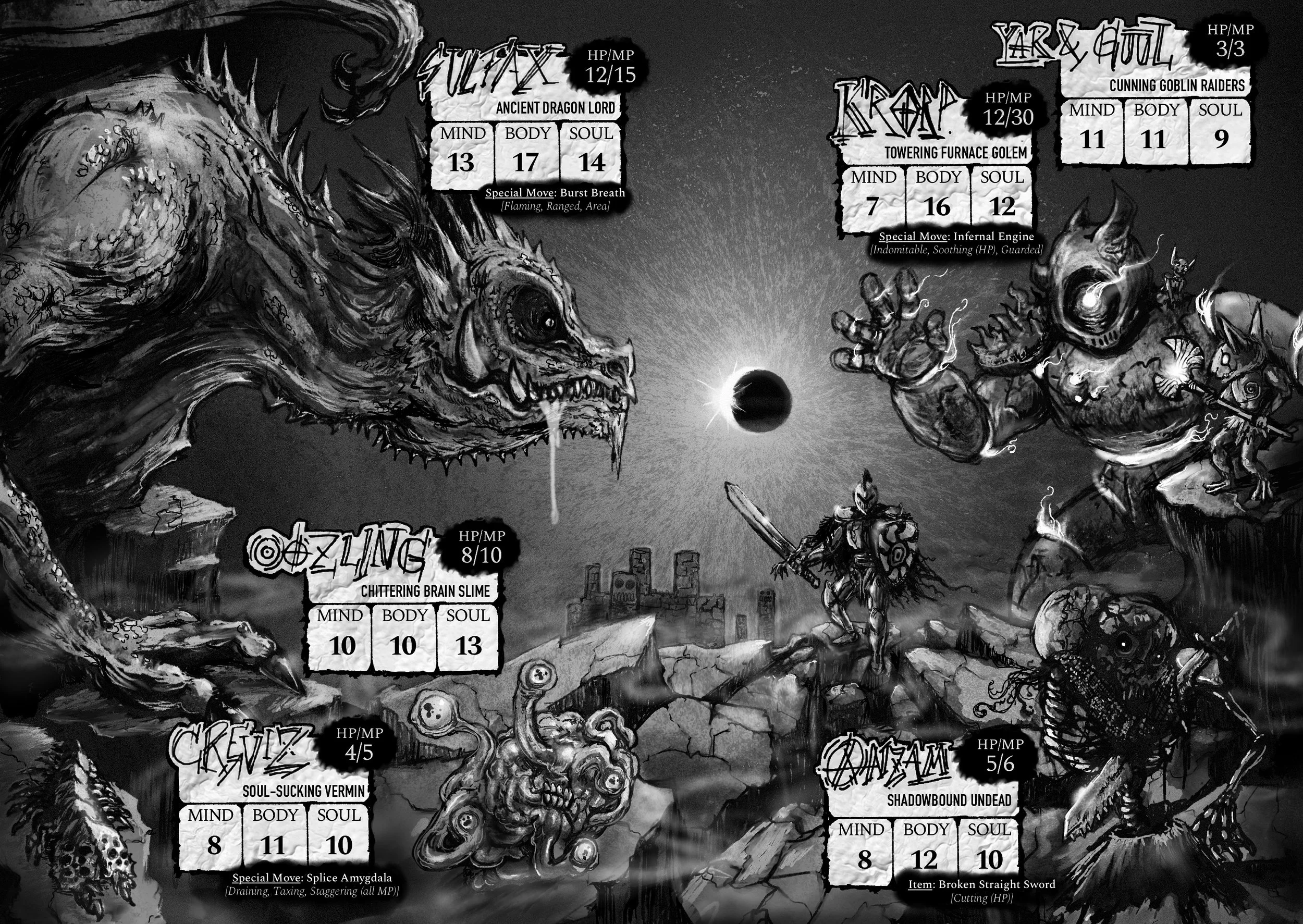 Digitally illustrated 2-page spread for KeywordRPG: a rulebook for a role-playing system being developed by Sixten Machado, who crafted the hand-lettering for each creature’s name. Textbox design and type by me.
